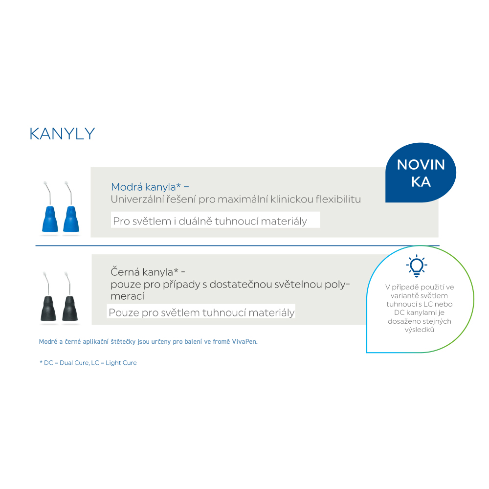 • DC kanyly pro Vivapen jsou potažené ko-iniciátorem pro samotuhnutí - není třeba samostatného aktivátoru pro duální tuhnutí