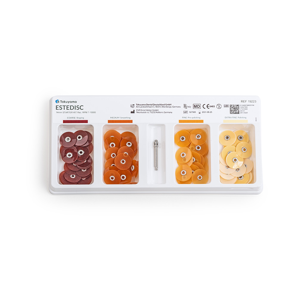 Různé velikosti zrna umožňují postupný pracovní postup pro dosažení optimálních výsledků s vysokou hladkostí povrchu. ESTEDISC jsou ideálně sladěné s kompozity Tokuyama Dental se sférickými plnivy a podporují vysoce estetické, trvanlivé a spolehlivé výplně.