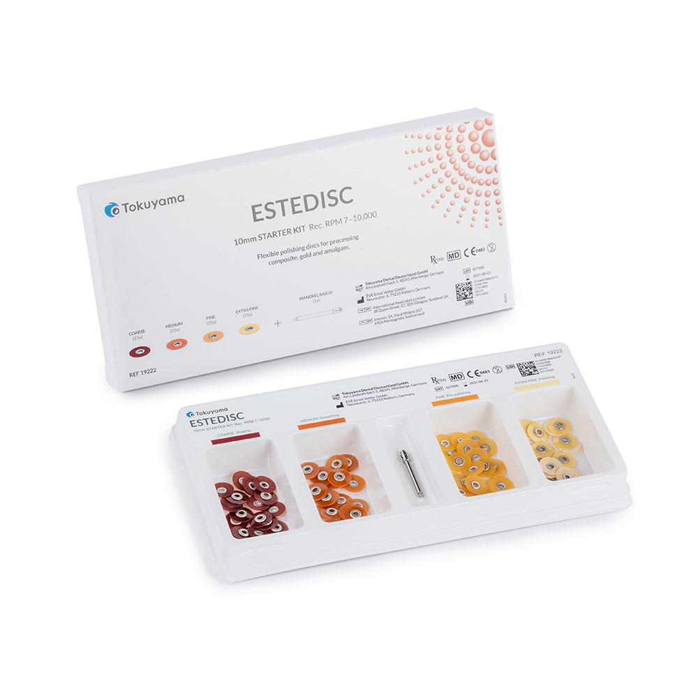 Různé velikosti zrna umožňují postupný pracovní postup pro dosažení optimálních výsledků s vysokou hladkostí povrchu. ESTEDISC jsou ideálně sladěné s kompozity Tokuyama Dental se sférickými plnivy a podporují vysoce estetické, trvanlivé a spolehlivé výplně.