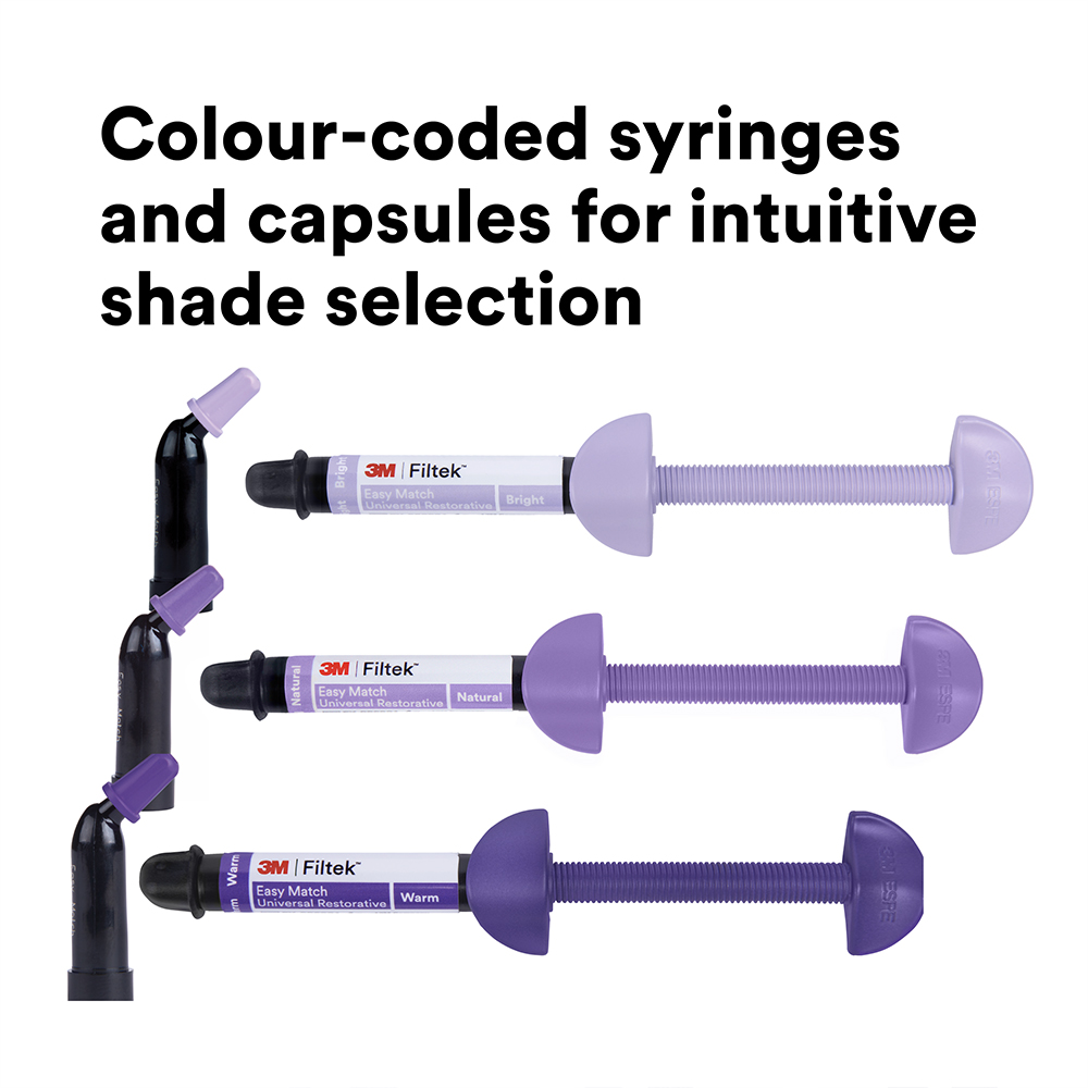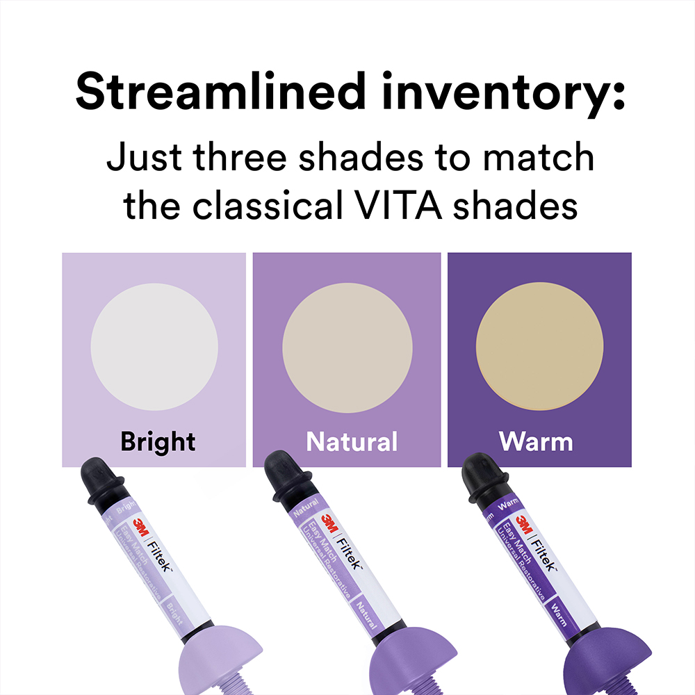 Univerzální výplňový systém 3M™ Filtek™ Easy Match je navržen tak, aby ve většině případů snadno a intuitivně dosáhl vynikajícího odstínu odpovídající přirozené barvě zubu. Odstíny klasické barevné škály VITA jsou pokryty pouze třemi barvami Bright, Natural a Warm.