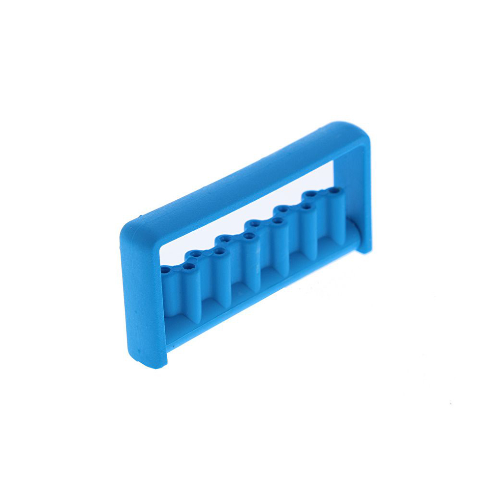 Stojan pro 8 FG vrtáčků a 4 RA vrtáčky. Autoklávovatelné do 121 °C. Rozměry: šířka 7,5 × hloubka 3,5 × výška 12 cm.