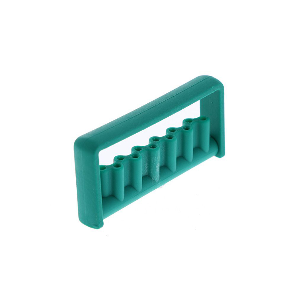 Stojan pro 8 FG vrtáčků a 4 RA vrtáčky. Autoklávovatelné do 121 °C. Rozměry: šířka 7,5 × hloubka 3,5 × výška 12 cm.